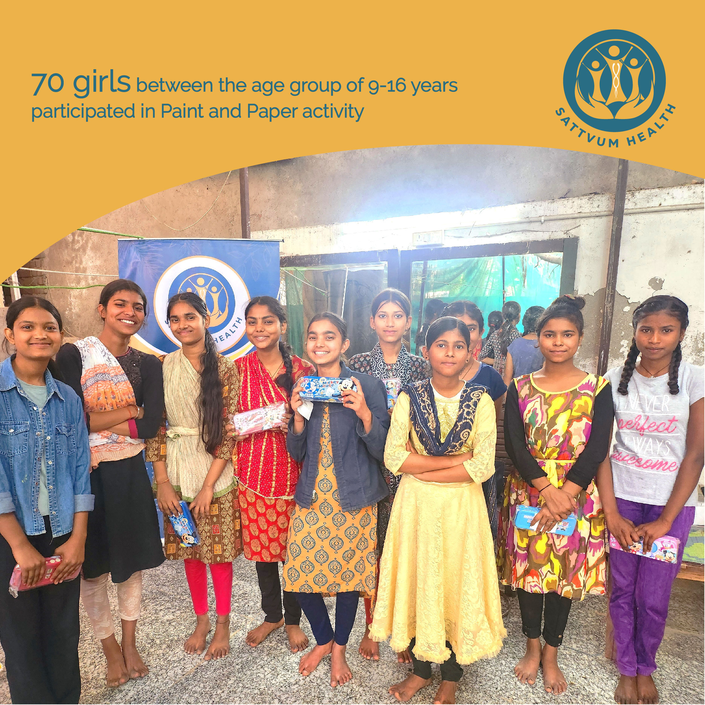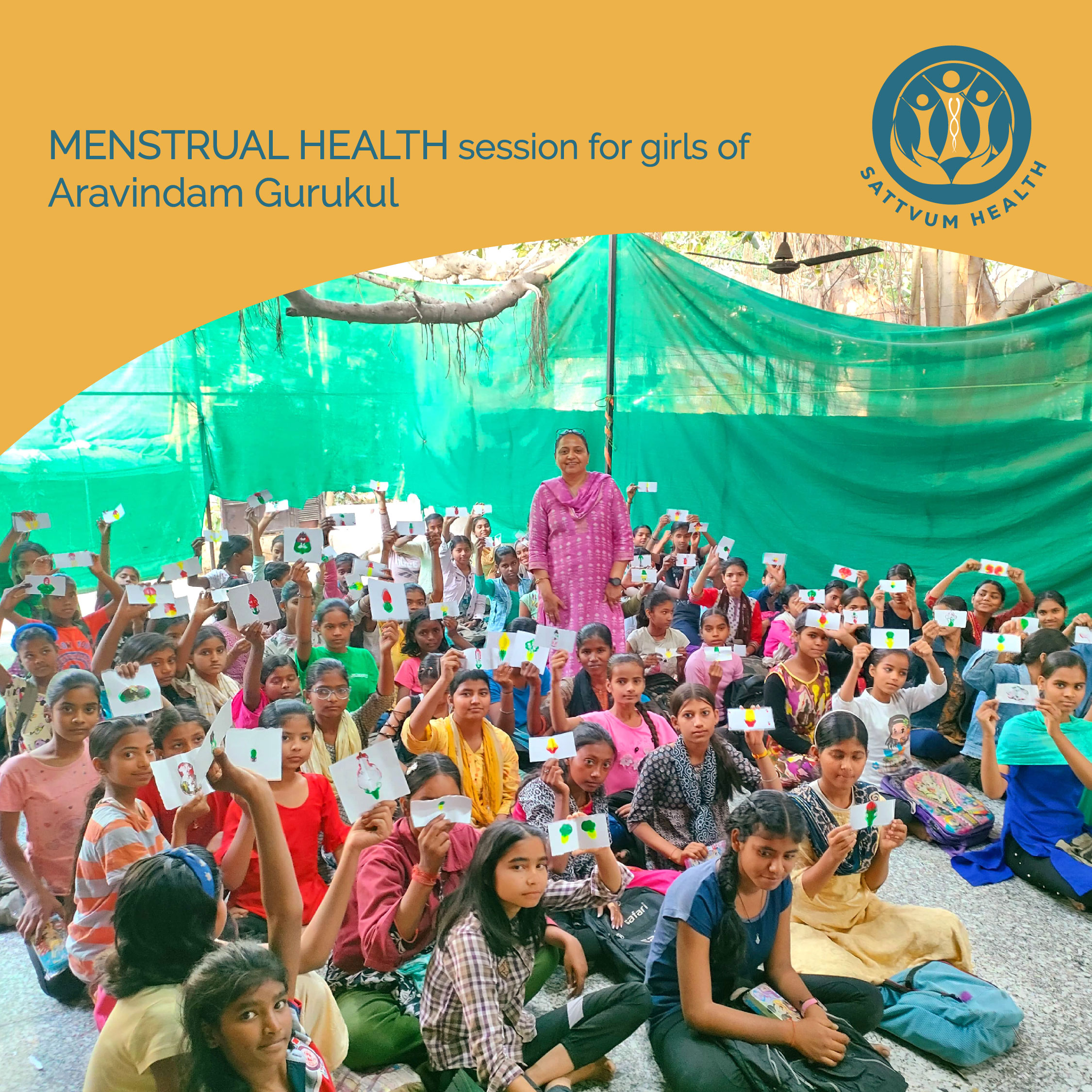 Menstrual Health session at Aravindam Gurukul saw enthusiastic participation from 70 girls between the age of 9 and 16. Activities based on paint and paper created awareness about their unique personalities and how they can shape a beautiful future. Volunteers identified to lead future sessions.